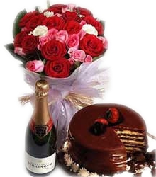 Celebrate with our exclusive Wine hamper Bunch of 12 red roses, 12 pink roses and 6 white roses with lots of seasonal fillers wrapped in a beautiful frill paper wrapping n raffia knot. To add on to the surprise we have finger licking 500gm chocolate cake and a supreme quality Sula Champagne wine bottle to top it all! this sparkling wine will enchant you with its pear and apple aromas, its crispiness and its wonderful finish.