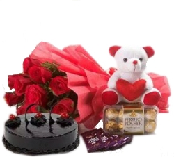 Gift this to your loved ones and see their hearts filled with joy. Bunch of 12 Red Roses Red Paper Packing Red Ribbon 5 Cadbury Chocolates (12.5 gm each) 6 Inch Soft toy Ferrero Rocher 200 gms 500gm Chocolate Cake