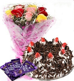 Bunch of 10 mix roses with half kg black forest cake and 5 dairy milk chocolate