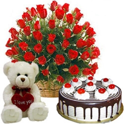 Basket arrangement of 30 Red Roses,10 inch Teddy and Half kg Black Forest Cake