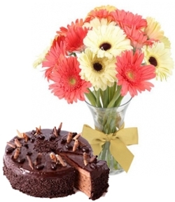 full of warmth, its guaranteed to make them smile. Bunch of 10 stems of Pink and White Gerberas along with 1/2 Kg Chocolate Cake