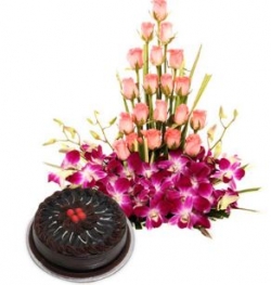 basket arrangement of 6 sensual purple orchids balanced by the heat and passion of the 20 pink roses and 1/2 kg Chocolate Truffle Cake