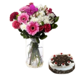 Mixed Bunch of 3 pcs Gerberas , 6 pcs Roses & 4 Pcs Carnations & white Fillers along with 1/2 Kg Black Forest Cake