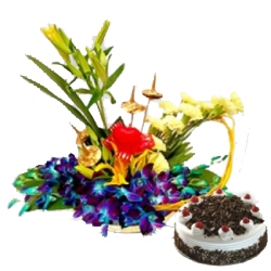 Basket of 6 yellow carnations, 10 blue orchids,2 yellow lilies with half kg black forest cake