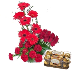 Basket Of 7 Red Carnations , 12 Red Roses & 10 Red Gerberas with greens along with 16 Pcs Ferrero Rocher Box