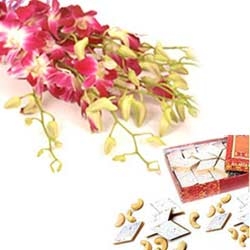 Make someone feel blessed with your hearteous wishes! bunch of 6 purple Orchids tied with a matching ribbon along with a classy 500gm box of kaju katli.