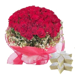A bunch of 30 beautiful roses packed in a paper with a red ribbon . Along with this, 500 gm Kaju Katli