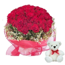 Bunch of 30 Red Roses with seasonal fillers wrapped in Net with 6 Inches Teddy Bear