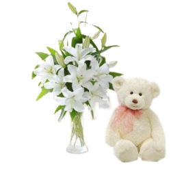 Bouquet of 5 stems of White Lilies along with 6 Inch Teddy Bear