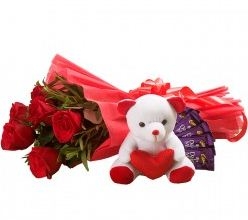 Bunch of 6 red roses in paper packing,6 inch teddy,5 dairy milk chocolate