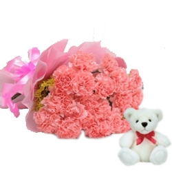 Bunch of 10 Pink Carnations with fillers with 6 Inches Teddy Bear