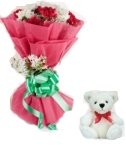 Bunch of 12 red and white Carnations along with 6 Inch Teddy Bear