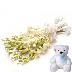 Bunch of 6 White Orchids and 6 inch height Teddy bear