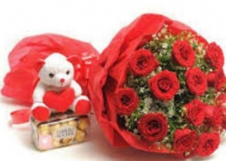 Bunch of 10 red roses with 6 inch teddy and 16 pcs fererro rocher box