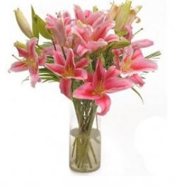 Glas vase Beautiful Arrangement of 6 pink oreintal lilies with green fillers decorated very nicely.