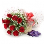 10 red roses in cellophane packing. 14 grams each of five dairy milk chocolate.