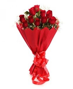 Bunch of 15 red roses in paper packing