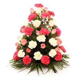 Basket arrangement of 40 mix colour flowers including 16 pink carnations, 6 white carnations, 12 pink roses and 6 white roses with green filler