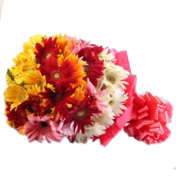 Friendship is far more tragic than love. It lasts longer. 20 mix colored gerbera in red paper packing. A wonderful bouquet of mixed gerberas, full of happiness and energy.
