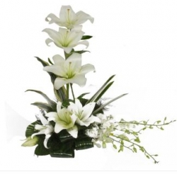 An arrangement of bouquet contains handpicked 6 White Asiatic Lilies and 4 White Orchids with green leaves.
