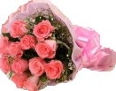 Bunch of 15 pink roses in cellophane packing