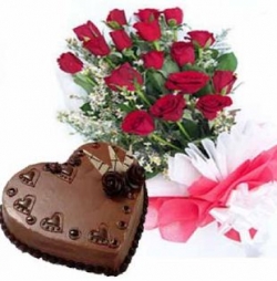 Bunch of 15 Red roses wrapped along with seasonal fillers with cellophane along with 1 kg heart shaped chocolate cake