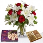 Bunch of 6 Red Roses & 5 White Lilies along with 1/2 Kg Mix Dry Fruits & 1/2 Kg Soan Papdi