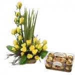 Arrangement of 15 Yellow Roses in a Basket along with 16 Pcs Ferrero Rocher Box