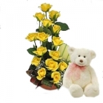 Basket Arrangement of 15 yellow Roses to get it started ...with 6 Inches Teddy Bear
