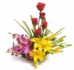 Beautiful basket of 5 red roses, 3 Lilies and 4 Orchids for your loved ones