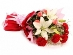Bouquet of 2 White Asiatic Lilies, 5 Red Carnations, 5 Pink Roses and Seasonal Fillers.