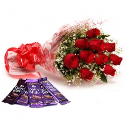 Send your loved ones bunch of 10 beautiful red roses covered with lots of fillers and packed in cellophane sheets and 14 grams each of five 5 dairy milk chocolate.