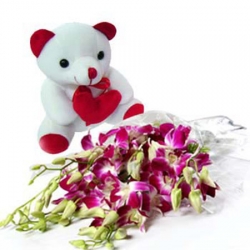 Express your love differently to your near and dear ones. Parcel your love and passion through this perfect art flower combo of 6 purple orchids beautifully arranged in a magnificent bunch along with seasonal fillers exclusively wrapped in a cellophane sheet. This stunning arrangement comes along with a cute teddy bear