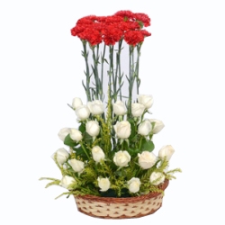 25 white Roses and 15 Red Carnation in a Tall Basket Height 1.5 feet (Green Leaves and Filler Decoration)