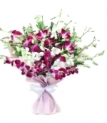 this exquisite flower arrangement of beautiful 10 purple and white orchids in paper packing